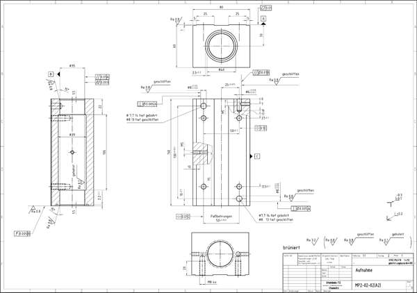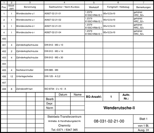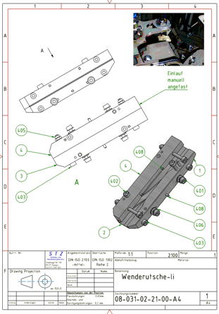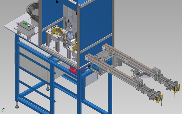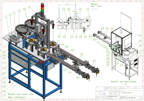 Dabei ist einerseits die geforderte Ausrichtung der Teile herzustellen und zu sichern, und andererseits eine Qualitätskontrolle mittels Bildverarbeitungssystem durchzuführen. Es wurden die vollständigen Konstruktionsunterlagen für die Herstellung einer solchen Zuführung erstellt. Dazu gehören Stücklisten, Fertigungs- und Montagezeichnungen, Strom- und Anschlusspläne sowie Pneumatik- und Hydraulikunterlagen. Die in unserem Unternehmen komplettierte Anlage läuft im Mehrschichtbetrieb ohne Beanstandung seit mehreren Jahren.